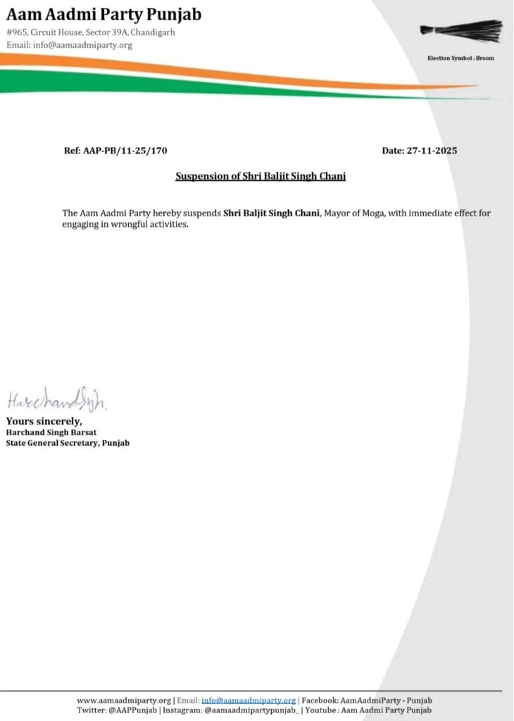 पार्टी ने अपने पत्र में गंभीर आरोप लगाते हुए कहा कि मेयर बलजीत सिंह चन्नी के नशा तस्करों के साथ करीबी संबंध पाए गए हैं, जांच में ऐसे पुख्ता सबूत मिले हैं, जिसके बाद पार्टी ने उन्हें बाहर करने और मेयर पद से हटाने का निर्णय लिया।