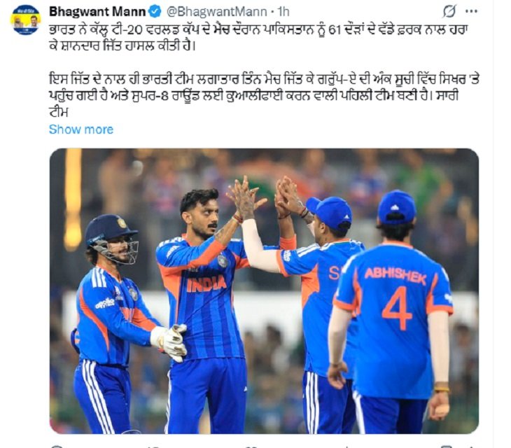 आज सुबह साढ़े सात बजे सीएम भगवंत मान की तरफ से अपने सोशल मीडिया अकाउंट एक्स पर पोस्ट डालकर भारत को टी-20 वर्ल्ड कप मैच में पाकिस्तान के खिलाफ मिली जीत की बधाई दी। उन्होंने पोस्ट में लिखा है भारत ने कल टी-20 वर्ल्ड कप के मैच में पाकिस्तान को 61 रनों के बड़े अंतर से हराकर शानदार जीत दर्ज की है।