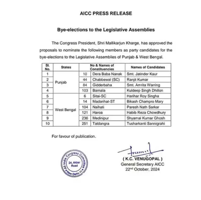 Punjab में होने वाले उपचुनाव के लिए कांग्रेस ने उम्मीदवारों की घोषणा करदी, देखें पूरी लिस्ट