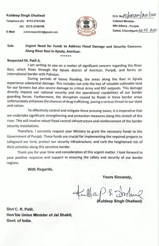 कुलदीप धालीवाल ने पत्र में लिखा कि भारी बारिश के दौरान अमृतसर के अजनाला के पास रावी नदी के इलाकों में बाढ़ से न केवल किसानों की खेतीबाड़ी को नुकसान होता है। बल्कि सीमा पर तैनात सेना और बीएसएफ की चौकियों को भी गंभीर क्षति होती है, जो देश की सुरक्षा पर प्रतिकूल प्रभाव डालती है।