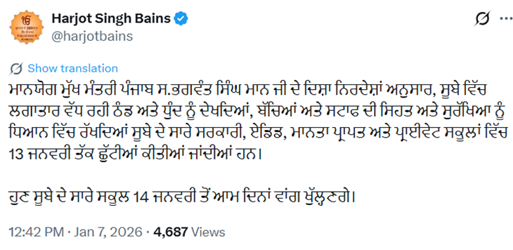 उन्होंने कहा कि राज्य में लगातार ठंड और धुंध बढ़ रही है। बच्चों और स्टाफ की सेहत व सुरक्षा को देखते हुए 13 जनवरी तक स्कूलों की छुट्टियां रहेंगी।