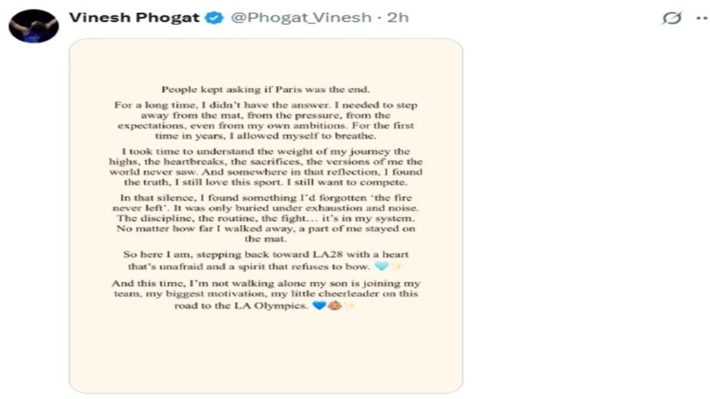 विनेश फोगाट ने लिखा है कि अनुशासन, दिनचर्या, संघर्ष यह सब मेरे अंदर बसा है। चाहे मैं कितनी भी दूर चली जाऊं, मेरा एक हिस्सा मैट पर ही रह गया। कुश्ती को लेकर मेरा जोश कभी खत्म नहीं हुआ। मैं अब यहां निडर दिल और कभी न झुकने वाली भावना के साथ LA28 की ओर वापस कदम बढ़ा रही हूं। इस बार मैं अकेली नहीं चल रही हूं। मेरा बेटा मेरी टीम में शामिल हो रहा है। लॉस एंजिल्स ओलंपिक के इस सफर में मेरा छोटा सा चीयरलीडर।